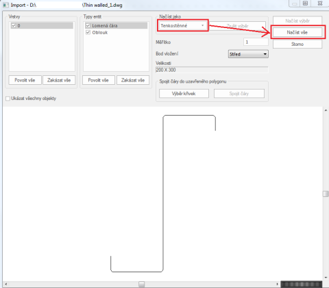 Po výběru souboru k importu, je zapotřebí zvolit načíst jako "Tenkostěnné" a následně kliknout na "Načíst vše".
