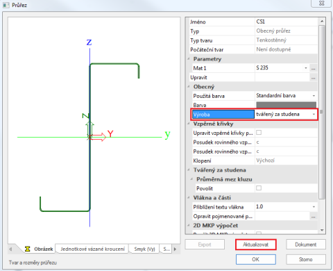 Po zavření editoru průřezu je průřez ukázán. Je důležité zkontrolovat volbu Výroba (např. tvářený za studena, válcovaný, …). Po kliknutí na "Aktualizovat", SCIA Engineer vypočítá automaticky průřezové charakteristiky.
