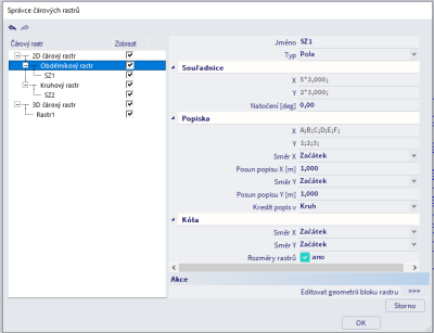 Tlačítko Přídavná nastavení pro otevření Správce čárových rastrů (k dispozici od verze SCIA Engineer 2010.1). Správce čárových rastrů můžete najít také prostřednictvím SCIA Spotlight. Ve Správci čárových rastrů můžete postupně zobrazovat nebo skrývat čárové rastry a můžete měnit nastavení čárových rastrů a/nebo geometrii.