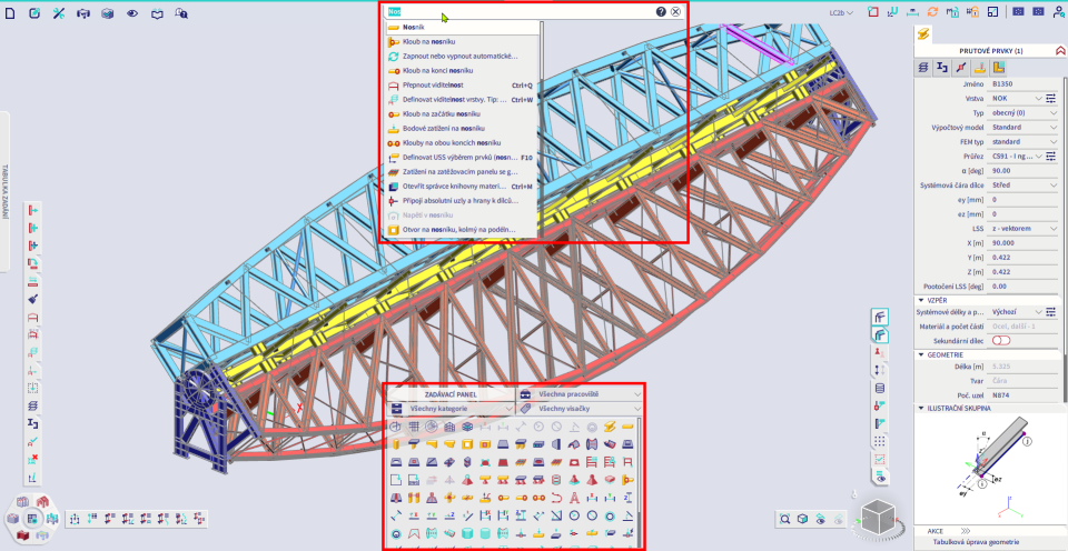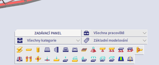 Jakýkoli objekt dostupný ve SCIA Engineer lze zadat přes Zadávací panel. Protože ve SCIA Engineer existuje velké množství různých objektů, umožňuje panel pracovat s pracovišti a oddělenými kategoriemi. Můžete tak začít s pracovištěm "Konstrukce" pro zadávání konstrukčních prvků a jejich okrajových podmínek a poté můžete pokračovat v aplikaci zatížení pomocí pracoviště "Zatížení". Stejně jako hlavní nabídka nebo SCIA Spotlight zobrazuje Zadávací panel stručnou nápovědu, pokud nad nějakým příkazem ponecháte kurzor myši 2 sekundy bez pohybu.