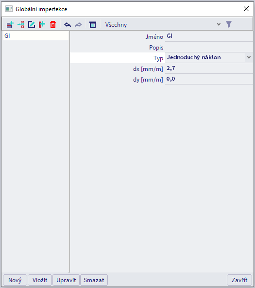 Globální nedokonalosti jsou definovány a uloženy ve zvláštní knihovně, kterou lze otevřít přímo v dialogu nelineárních kombinací nebo prostřednictvím Knihovny > Případy zatížení, Kombinace > Globální nedokonalosti.