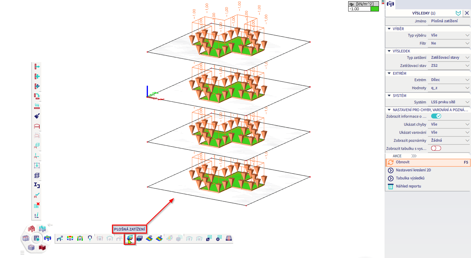 Od SCIA Engineer verze 22.0 je také možné zobrazit vygenerovaná zatížení po výpočtu přes Hlavní menu > Výsledky > Plošná zatížení: