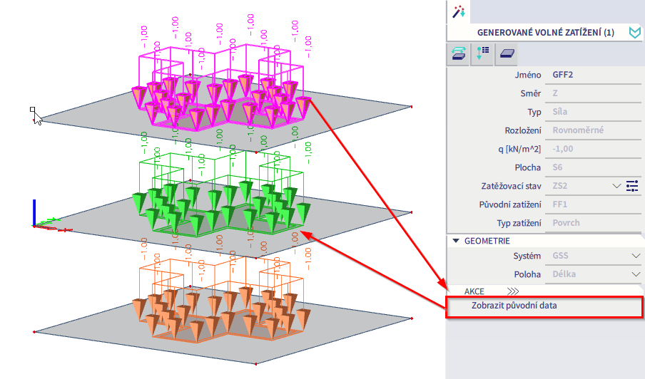 Pro zobrazení vygenerovaného zatížení (pro různé nastavení) použijte akční tlačítko v panelu vlastností "Generovat zatížení".