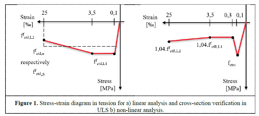 Physical non-linear analysis represents a very powerful tool for analysing any kind of structure in civil engineering created not only from steel fibre reinforced concrete but also from other materials. Generally, there could be significant differences of results compared to a linear analysis, especially in case of hyper-static structures. In case of linear analysis, only the E-modulus of the material is considered for the preparation of the stiffness matrix. There is no stress distribution based on increasing the strain in the component. On the other side the non-linear analysis provides a stress distribution and increase of the bearing capacity after reaching the ultimate strain until the collapse mechanism. This mechanism is based on different values of stress and strain, dependent on a predefined non-linear stress- strain relationship in the material diagram as defined on Figure 1.