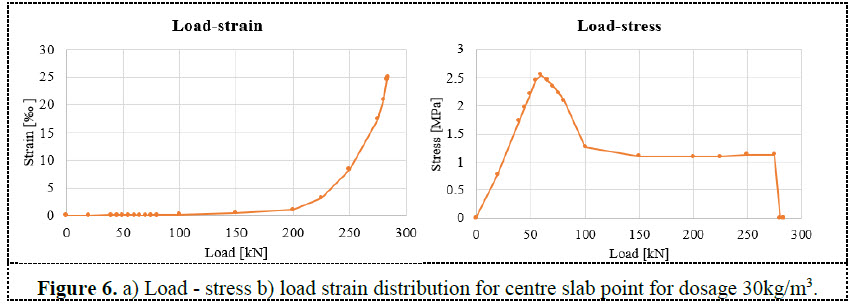 The presented non-linear model provides a good match with the experimental test. The comparison of the results with the load-displacement diagram coming from the test is visible on Figure 4 for Dramix fibres 5D65/60BG with dosage 30kg/m3 and 35kg/m3. This capacity is at the load level 283,9kN (299,0kN for 35kg/m3 respectively) where the ultimate tensile strain in steel fibre reinforced concrete (25‰) is reached.