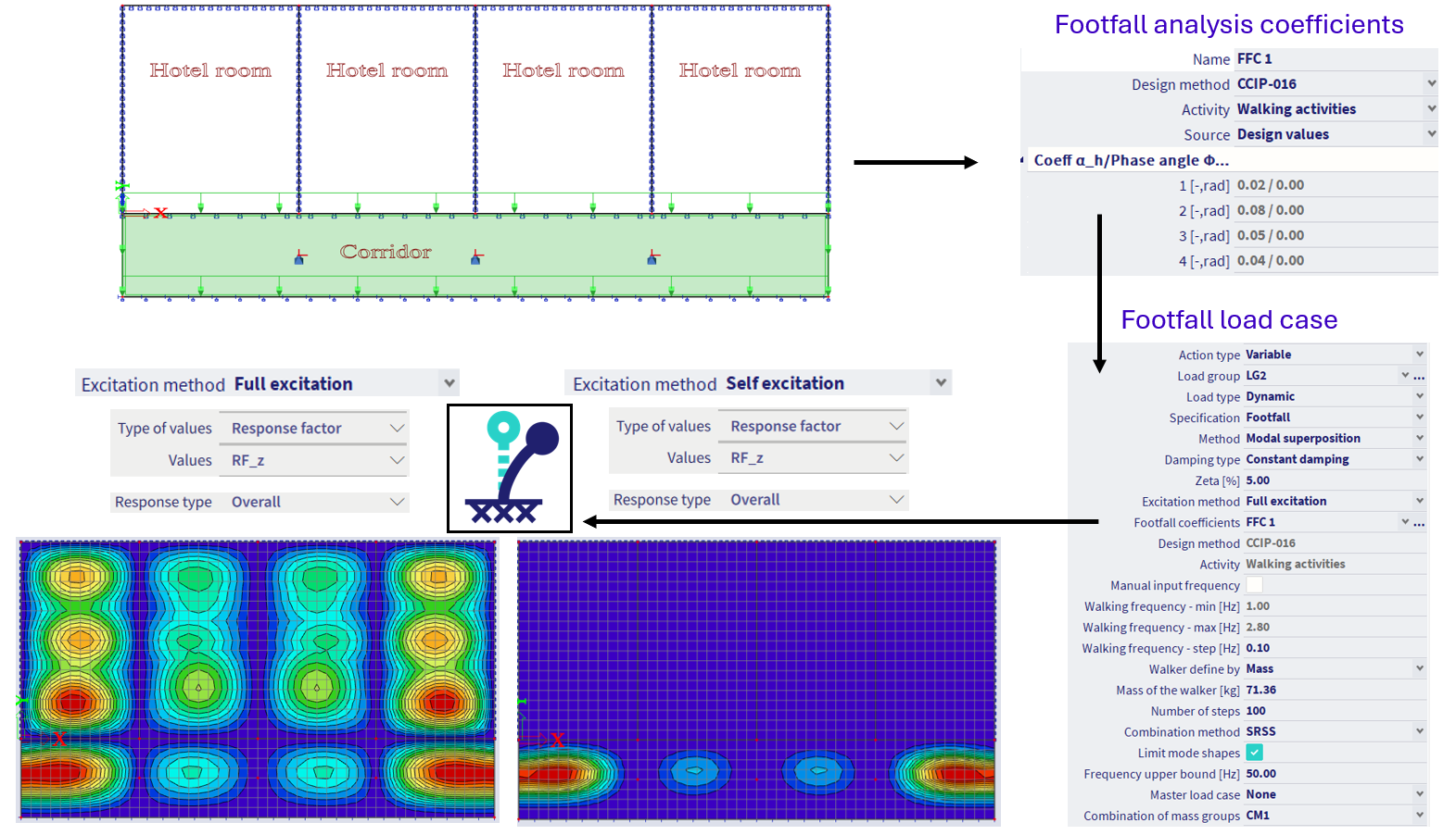In buildings featuring large, open spaces — such as offices, shopping centres, stadiums, and footbridges — or in structures with lightweight floors (e.g. composite floors) or in buildings with sensitive equipment, vibrations caused by human activity can lead to discomfort or operational problems. Footfall analysis allows engineers to evaluate how the structure responds to these human-induced vibrations. With the insights gained from this analysis, engineers can adjust the structural design early in the project to keep vibrations within acceptable limits, ensuring occupants’ comfort and protecting sensitive equipment. This proactive approach helps avoid costly modifications after construction that might otherwise be required to address unsatisfactory structural performance.