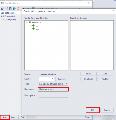 At this point a new bridge combination can be created via the menu combination, selecting the correct “structure type”: