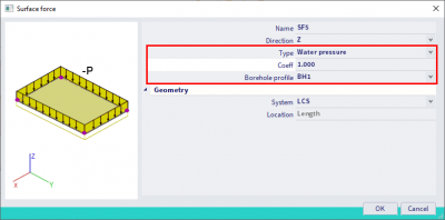 Remark: if you want to insert a water pressure, you need to select Water pressure as type of surface force. The coefficient can remain equal to 1 since there is no difference in vertical and horizontal pressure for water.