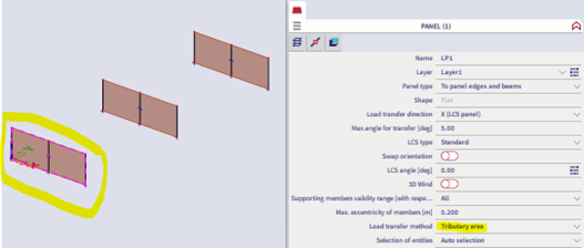 In the above example, the load would be distributed by 1/3, 1/3, 1/3 on each bar, because factor 1 is defined on each bar (even if the load is a linear or a point load in a corner of the panel).