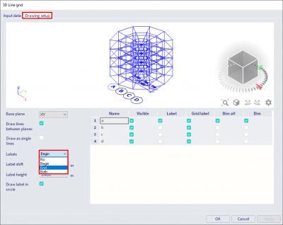 When using a cylindrical line grid, the labels showing the different radius of the grid are not shown. Therefore these labels can’t be used to automatically generate overview drawings using the image wizard. Therefore go to the tab ‘Drawing Setup’. Here the option ‘Labels’ is set to ‘Begin’. This means that all the labels are shown at the beginning, which in this case, means that all the labels are projected in the center of the line grid and are thus not visible. By changing this option to ‘End’, the labels are visible and can be used in the image wizard for creating overview drawings: