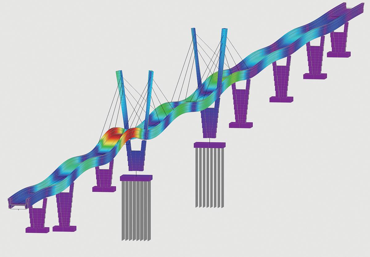 SCIA Engineer was used for a comprehensive simulation of the behaviour of the cable-stayed and pre-stressed concrete structure. The construction stage module allowed us to estimate the initial stage of the structure and determine cable forces. We also used the dynamics module for both a free vibration analysis and seismic analysis. The support stiffness iteration helped us optimise the type and size of the bridge foundations in order to minimize the disruption of the railway yard.