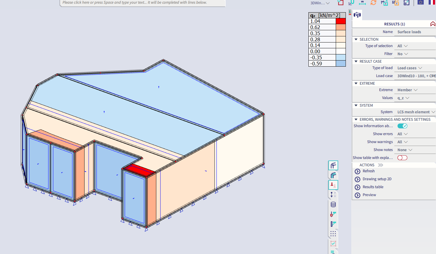 Enfin, le nouveau générateur de charges de vent 3D calcule correctement la charge de vent sur les structures avec des ouvertures selon l'Eurocode EN1991-1-4 (Figure 3).