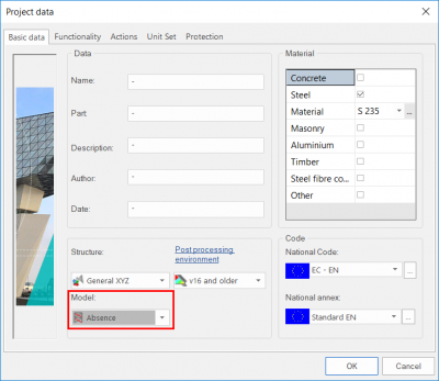 - Avant SCIA Engineer 19.0, la fonctionnalité « Modificateurs de modèle » n’existait pas. Au lieu de cela, vous deviez activer le service 'Absences' avec le paramètre 'Absence' dans la fenêtre de données du projet. Avant SCIA Engineer 19.0, les absences ne pouvaient être utilisées qu’en combinaison avec l’ancien environnement de post-traitement (v16 et versions antérieures).