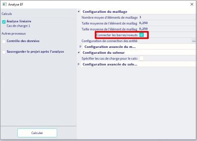 Depuis SCIA Engineer 19.0, la structure est liée automatiquement lors du calcul via une case à cocher dans la boîte de dialogue de calcul. Si vous ne souhaitez pas connecter la structure, il est nécessaire de désactiver l’option Connecter les membres/nœuds dans la boîte de dialogue de calcul :