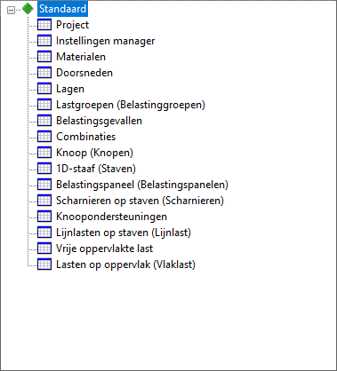 Vandaar begin je best met het onderdeel ‘Project’, vervolgens voeg je onderdelen uit de groepen ‘Bibliotheken’, ‘Verzamelingen’, ‘Constructie’ en ‘Last’ toe en nadien kan je alle andere onderdelen die je nodig hebt toevoegen.