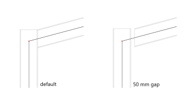 Met eind snede, kan je het einde van je element manueel aanpassen. Het hergenereren van het constructiemodel is noodzakelijk voordat de aanpassingen zichtbaar zijn. In het onderstaande voorbeeld wordt links structuur zonder gat getoond en rechts een structuur met een gat van 50mm dat gedefinieerd werd tussen het einde van de ligger en de kolom.