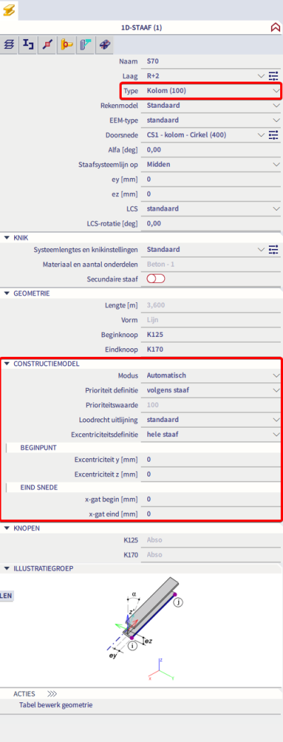 Als het constructiemodel is ingeschakeld, zal er in de eigenschappen van elk element een nieuwe sectie worden weergegeven voor het constructiemodel. Dit wordt wel enkel weergegeven in het geavanceerde menu dus zorg ervoor dat je dit hebt ingeschakeld via de rode pijl rechts bovenaan het eigenschappenpaneel. Prioriteiten, uitlijningen, excentriciteiten en gaten of snedes kunnen hier worden gedefinieerd. De principes worden hieronder toegelicht.