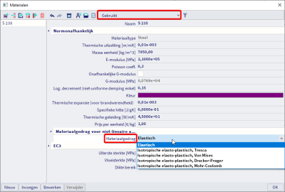 Wanneer deze geactiveerd zijn kan er een plastisch gedrag toegekend worden aan de gebruikte materialen in het project. Ga naar de materiaalbibliotheek (Hoofdmenu > Bibliotheken -> Materialen) en verander de filter naar ‘Gebruikt’ (zie afbeelding). Het materiaalgedrag kan nu gewijzigd worden van ‘Elastisch’ naar ‘Isotropische elasto-plastisch’ met een bepaald vloeicriterium. Voor staalmaterialen wordt het gebruik van ‘Von Mises’ aangeraden.