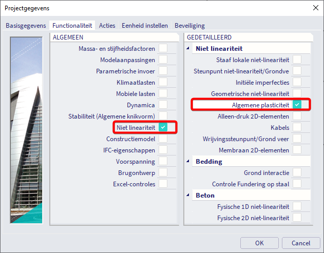Om plastisch gedrag aan 2D elementen te kunnen toevoegen, activeer je de volgende twee functionaliteiten in de projectgegevens: