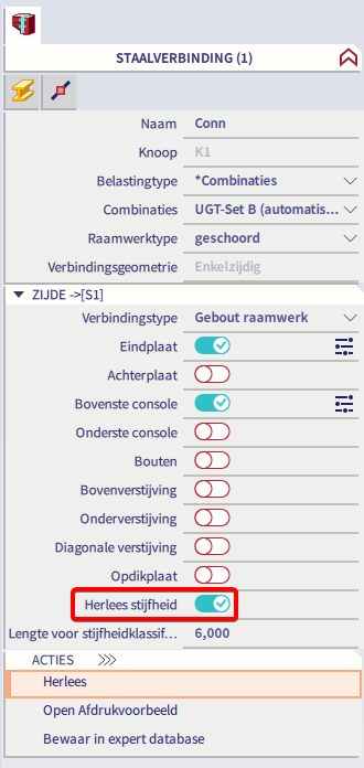 Wanneer een staalverbinding gemodelleerd is op een knoop, is er een optie ‘Herlees stijfheid’ beschikbaar in het Eigenschappenmenu. Door deze te selecteren, wordt de waarde van de veerstijfheid van de verbinding automatisch berekend. Wanneer de lineaire (of niet-lineaire) berekening opnieuw uitgevoerd wordt, wordt in het analysemodel voor de verdeling van de interne krachten rekening gehouden met deze stijfheidswaarde.
