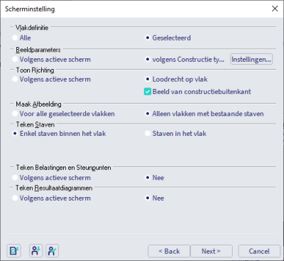 In het volgende dialoogvenster kunnen diverse algemene instellingen worden gewijzigd (Schaal, Tekstschaalfactor,...). In de volgende dialoog kan je de weergave-instellingen wijzigen. Hier kan je ook kiezen of je tekeningen wilt genereren voor alle vlakken of dat je een selectie wilt maken. Tenslotte kan je in het laatste dialoogvenster het raster selecteren en als je in de vorige dialoog Geselecteerd hebt gekozen, kan je ook hier de gewenste rastervlakken selecteren (als je in de vorige dialoog Alle hebt gekozen, is de knop Selecteer rastervlakken niet beschikbaar).