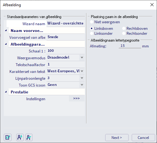 Gelijkaardig aan overzichtstekeningen kan de afbeeldingwizard gebruikt worden om tekeningen voor staalverbindingen te genereren.